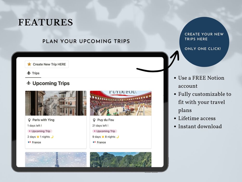 The "Upcoming Trips" section allows you to keep track of all your upcoming trips, their dates, and locations, making it easier for you to plan and schedule your itinerary. The template also includes an aside section for notifications and reminders, which can help you stay on top of your bookings, payments, and travel plans.