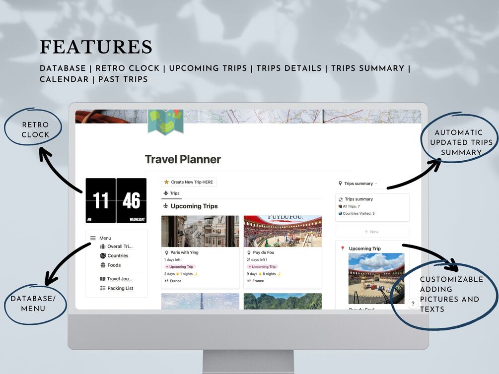 The template offers extensive features that help you plan your itinerary, keep track of your travel journal, and organize your packing list. It includes a clock widget that displays the time of your destination, making it easier for you to keep track of time differences and avoid jet lags. Additionally, the template includes links to lists of countries and foods that can help you plan your trip based on your preferences and interests.